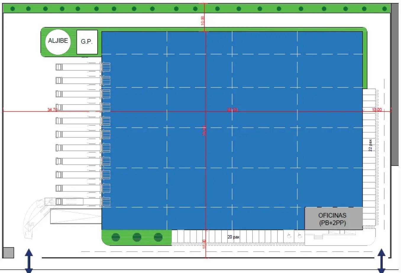 La nave tiene una superficie construida de 6.912 m² distribuida en 6.420 m² de planta baja y 492 m² de planta primera.