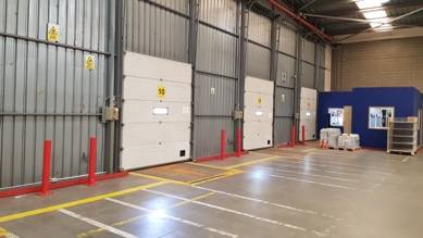 Puerta de acceso de camiones tipo TIR y 25 muelles de carga con plataforma hidráulica basculante.
